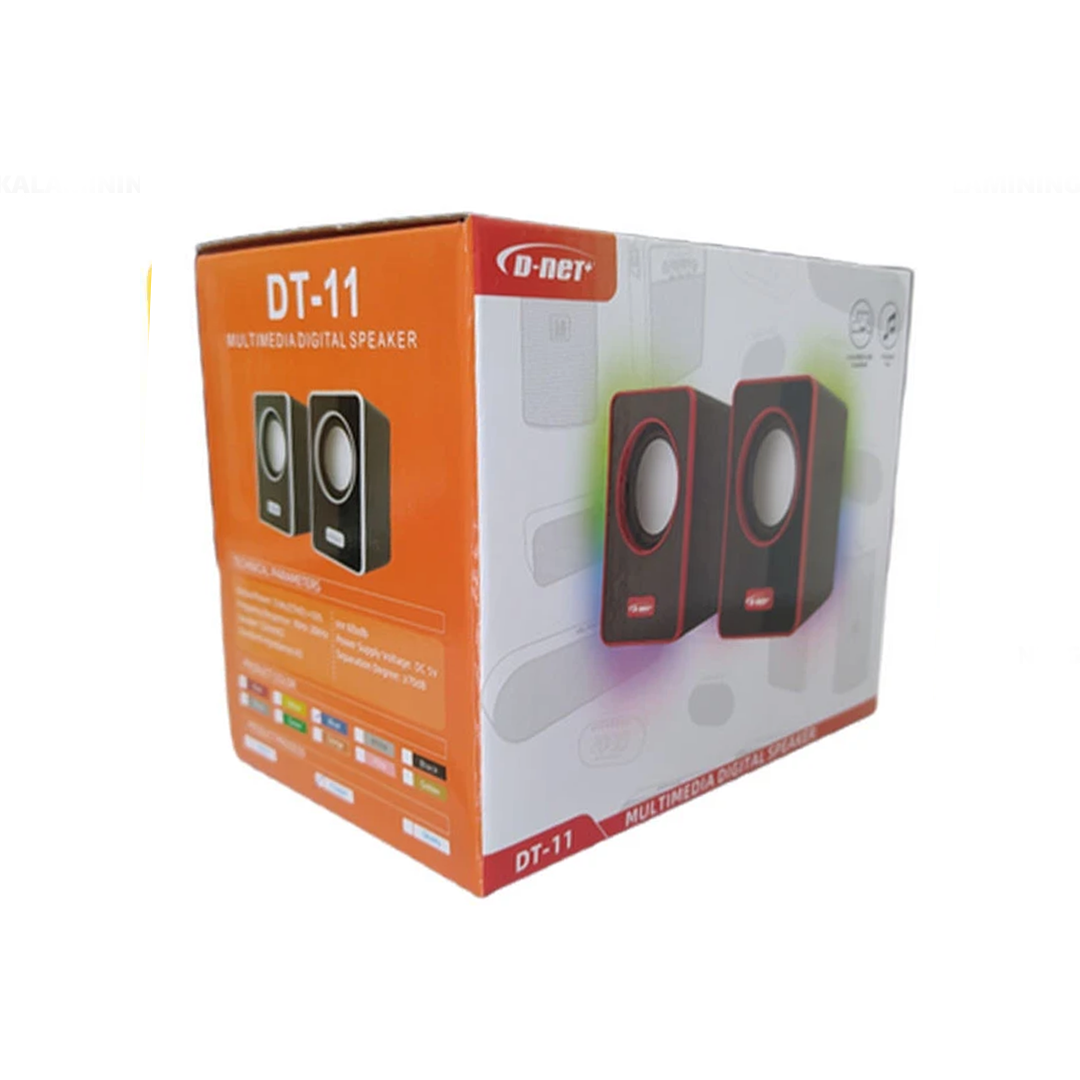 اسپیکر دی نت مدل DT-11 یک اسپیکر جمع و جور و کاربردی از نوع اسپیکرهای استریو می باشد که دارای توان خروجی 6 وات واقعی (هر تکه 3 وات) می باشد. مصرف برق بسیار پایین و از طریق پورت USB و صدای استریوی مناسب برای استفاده روزمره، از دیگر ویژگی های این اسپیکر می باشد. این اسپیکر دارای LED رنگی بوده که جلوه بصری زیبایی به آن بخشیده است.