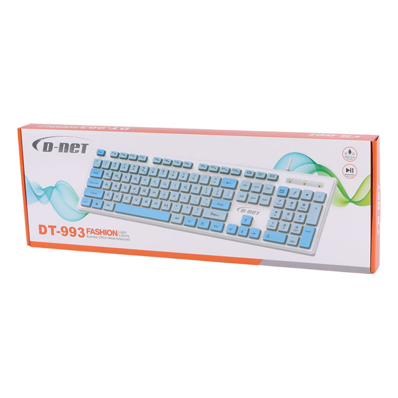 کیبورد سیم دار دی نت مدل DT-993 (آبی) چیست؟ کیبورد D-Net DT-993 یکی از مدلهای پایه و اقتصادی برند دینت است که برای استفاده روزمره، تایپ اداری، کار با کامپیوتر خانگی یا اداری طراحی شده است. این کیبورد سیمدار از طریق رابط USB به سیستم متصل میشود و اتصال پایداری دارد بدون نیاز به باتری یا شارژ.