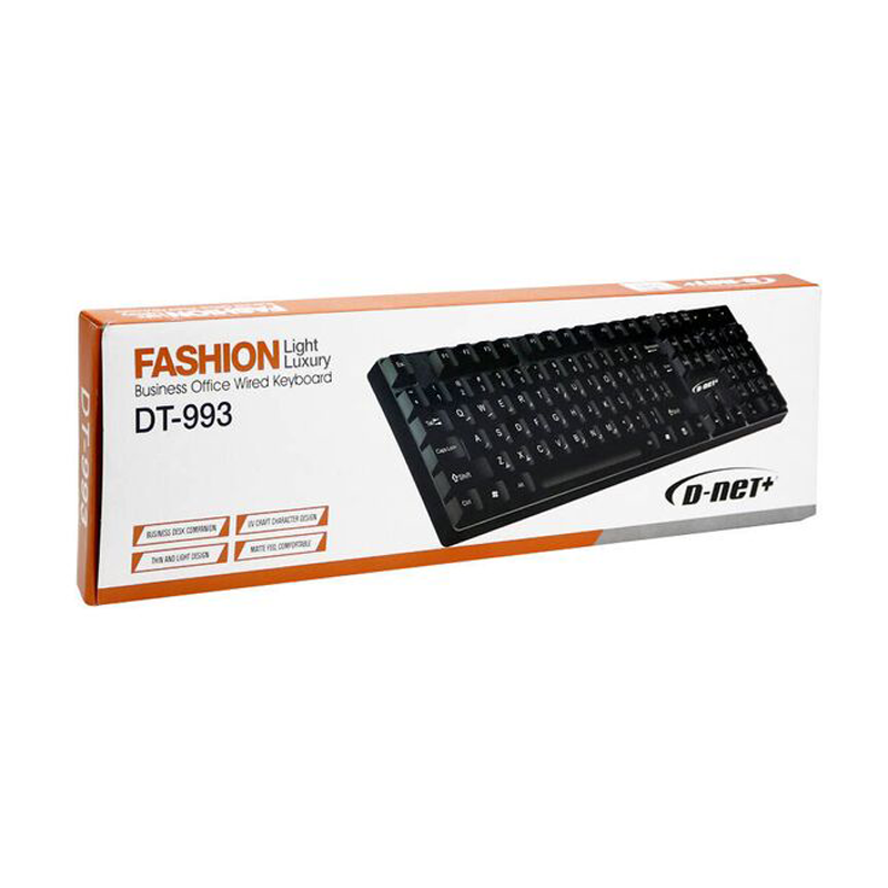 کیبورد D-Net مدل DT-993 یک کیبورد سیمدار بسیار مقرونبهصرفه و کاربردی است که از طریق پورت USB به کامپیوتر متصل میشود. این مدل شامل 104 کلید با حک فارسی است و بدنهای مقاوم دارد؛ همچنین کلیدها عمر بالا تا ۲۰ میلیون ضربه را دارند، که آن را برای استفاده روزمره، تایپ و کار اداری گزینهای مطمئن میکند.